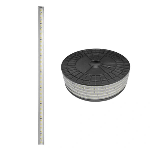 Tira extraplana de led 2835 con 120 leds por m rollo de 25 m, blanco cálido, atenuable, 7 Watts por m, óptica 120°,encapsulada en TPU, tecnología NONWIRE, CRI80, 127V ca, protección IP65.