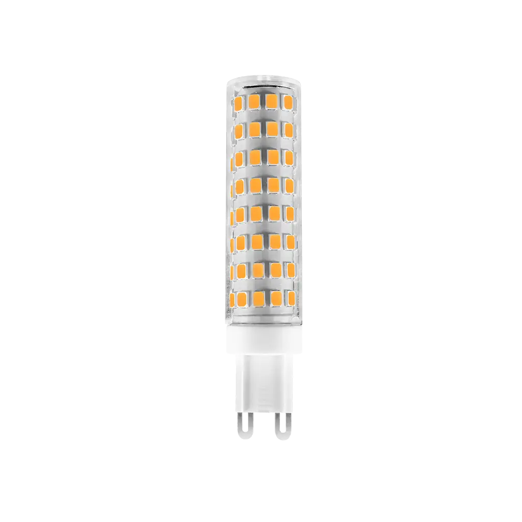 Lámpara base G9, de led, blanco cálido, 9 Watts, óptica 270°, cerámica con cubierta acrílico transparente, 110 – 265 Vca, protección IP20