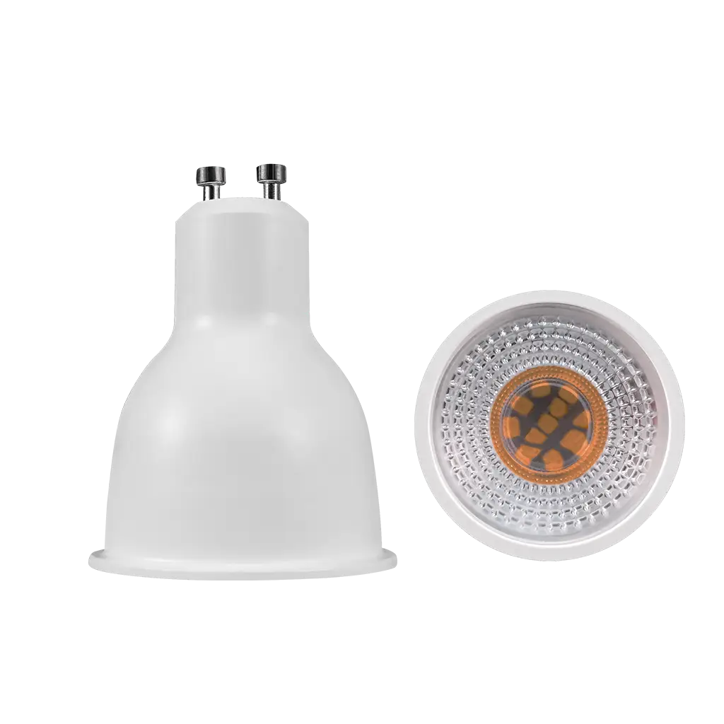 Lámpara tipo dicroico base GU10, de led, atenuable blanco cálido (3 000 K (Blanco cálido) K), 9 Watts, óptica 38°, carcasa de plástico cubierta transparente, 110-130V ca, protección IP20