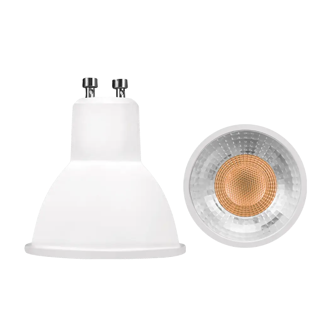 Lámpara tipo dicroico base GU10, de led, atenuable blanco neutro, 5 Watts, óptica 38°, carcasa de plástico cubierta transparente, 90-130V ca, protección IP20