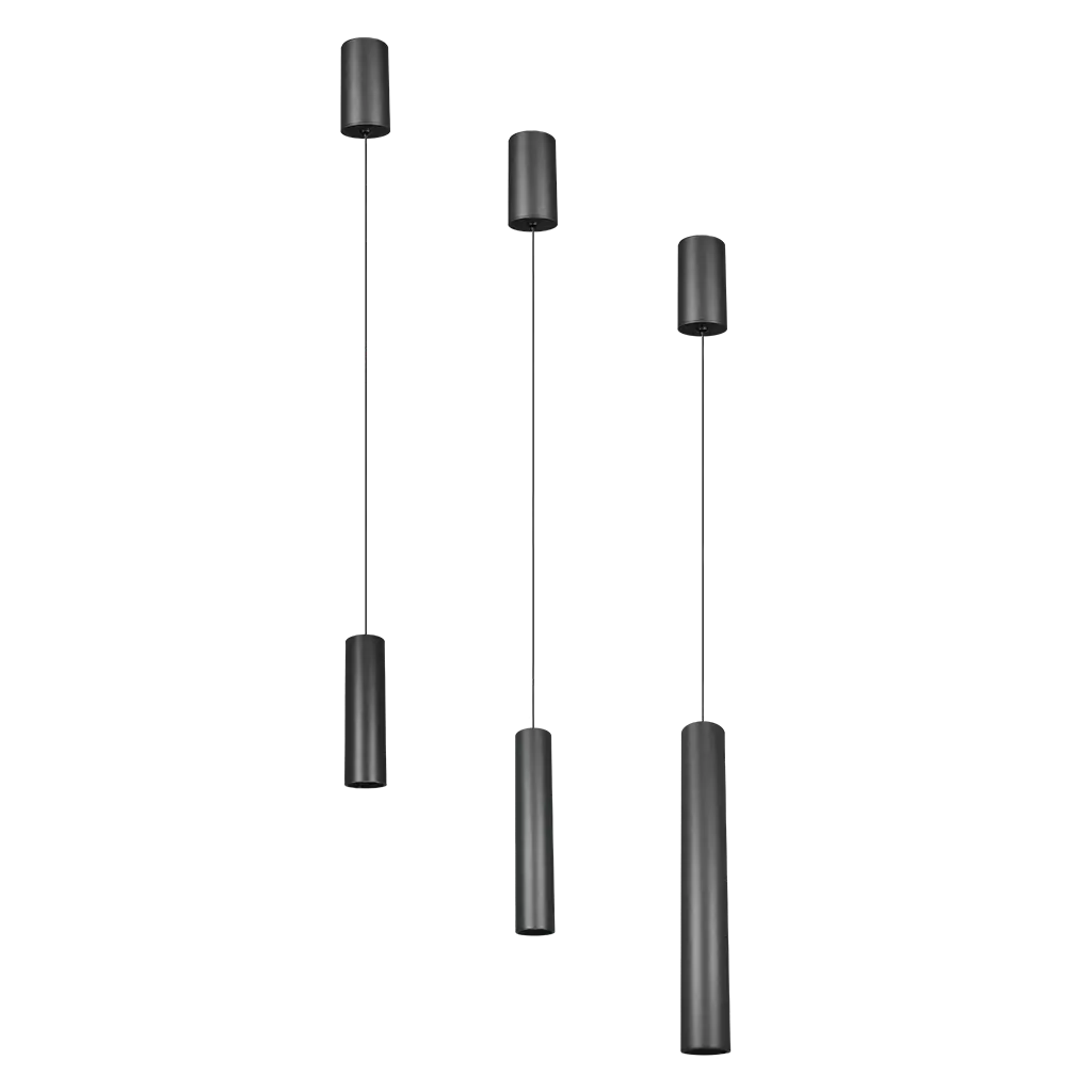 Luminario de suspender, de led, blanco cálido, 5 Watts, óptica 24°, cilíndrico de 40 cm de largo, de sobreponer en techo, aluminio acabado negro, 85 – 265V ca, protección IP20