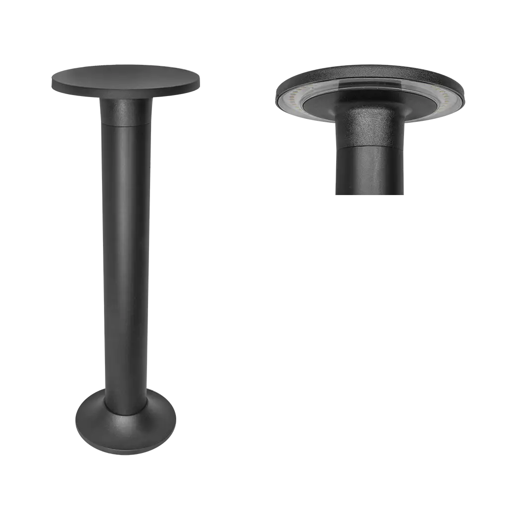 Poste tipo bolardo 50 cm de alto, de LED, blanco cálido, 8 Watts, de sobreponer, policarbonato acabado negro, 100-240V ca, protección IP54