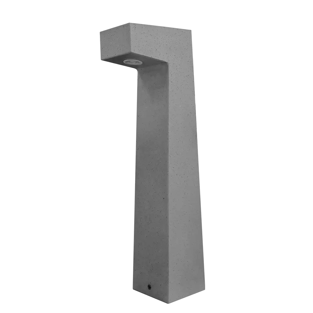Poste tipo Bolardo 70 cm de alto, de LED, blanco cálido, 5 Watts, óptica de 38°, de sobreponer, concreto acabado gris, 110–130 Vca, protección IP54.