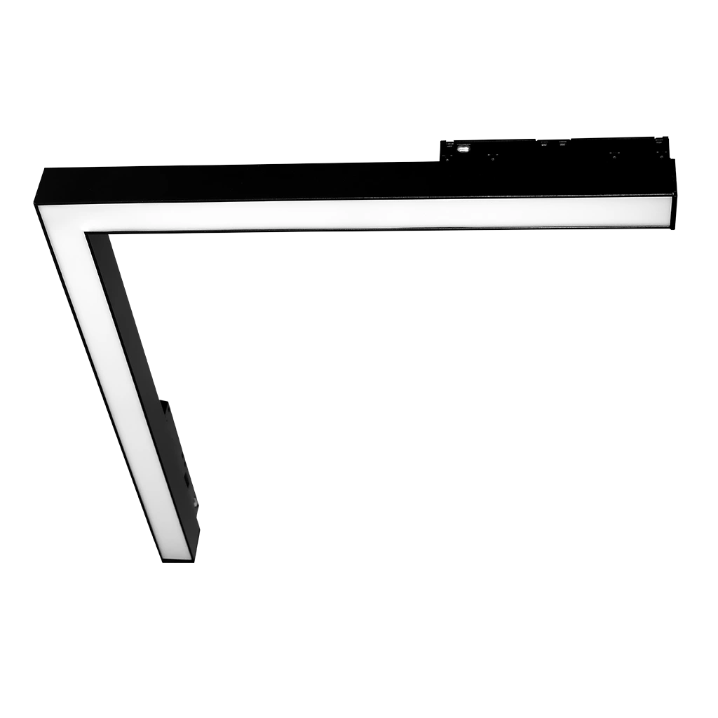 Luminario de LED para riel magnético, esquinero de 90° con luz frontal, 4 en 1 (2 700 K / 4 100 K / 5 500 K / Smart) 24 Watts, óptica 120°, aluminio acabado negro, 48V cc, protección IP20, con cambio de temperatura de color controlado vía interruptor físico o aplicación