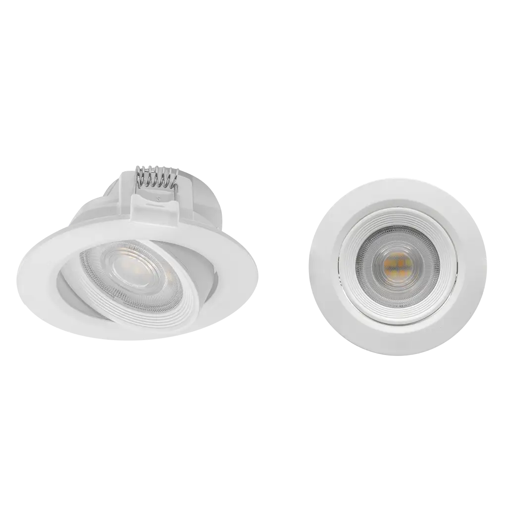 Luminario de techo, de LED, con temperatura de color seleccionable mediante interruptor, 7 Watts, óptica 60°, redondo, de empotrar, dirigible, policarbonato acabado blanco, 100-240V ca, protección IP54.
