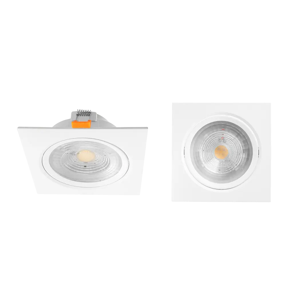 Luminario de techo, de led, blanco cálido, 12 Watts, óptica 42°, cuadrado, de empotrar, dirigible, aluminio acabado blanco y policarbonato, para bote integral de 10, 85-265V ca, protección IP20.