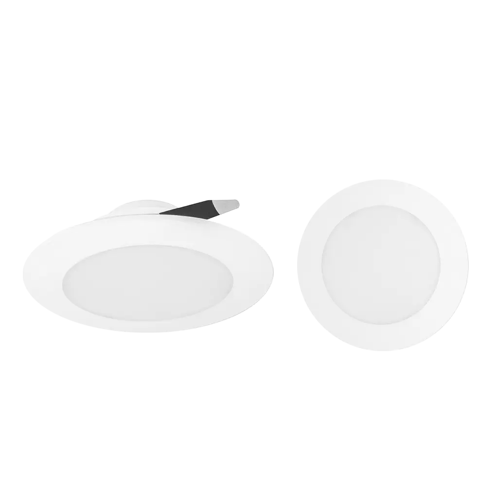 Luminario de techo, de led, blanco cálido, 9 Watts, óptica 120°, redondo, de empotrar, policarbonato, acabado blanco, driver atenuable con tecnología TRIAC, 110-130V ca, protección IP54