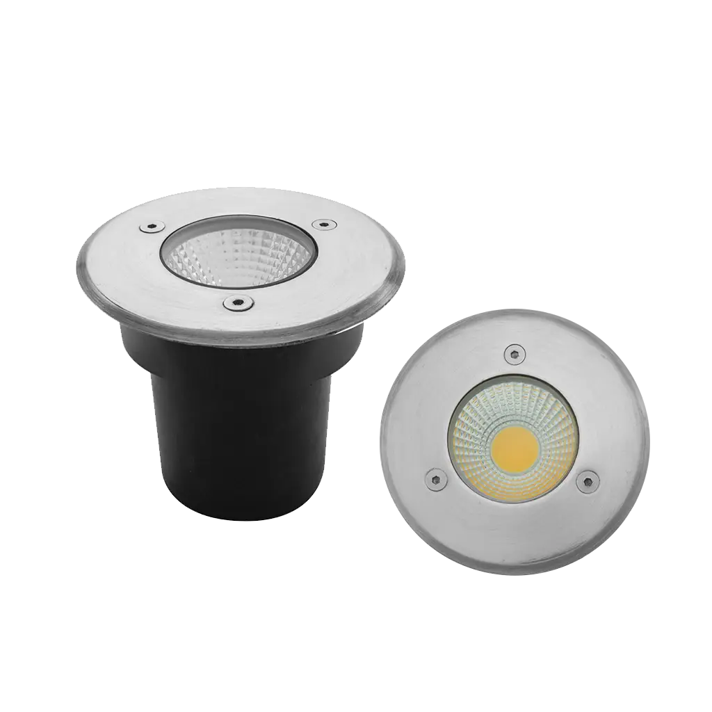 Luminario de piso, de led, blanco cálido, 5 Watts, óptica 120°, redondo, de empotrar, tapa de acero inoxidable cuerpo aluminio incluye housing, 85-265V ca, protección IP65.