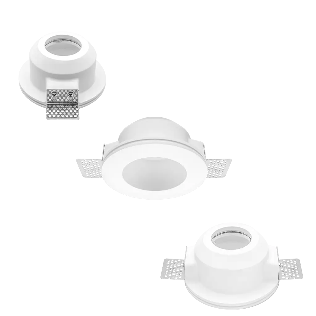 Luminario de techo, con base GU10 (sin lámpara) 25 Watts máximo, óptica de 120°, de empotrar trimless, yeso acabado blanco, 85 – 277 V ca, protección IP20.