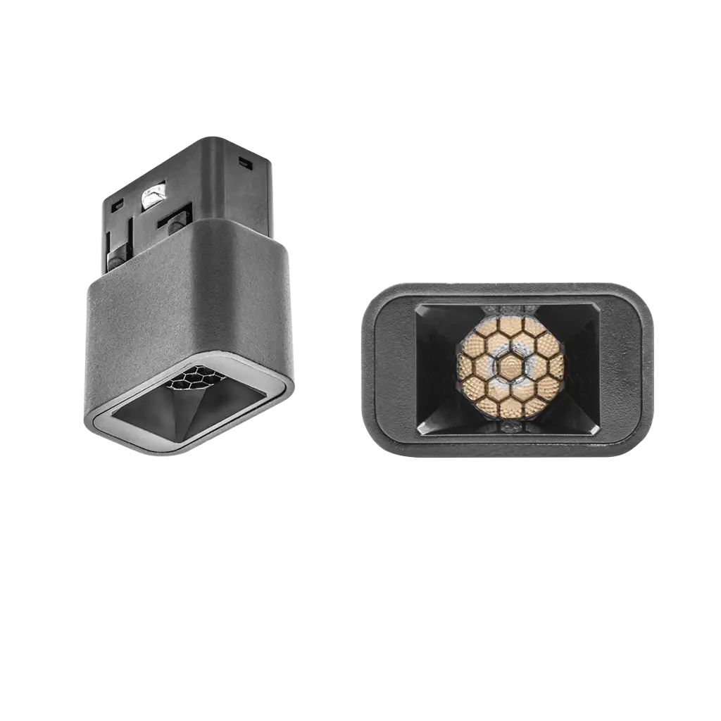 Luminario para riel magnético, puntual mini, rectangular, de LED, con filtro tipo louver honey, blanco cálido, 3 Watts, óptica 24°, UGR 19, aluminio acabado negro, 48V cc, protección IP20, no atenuable.
