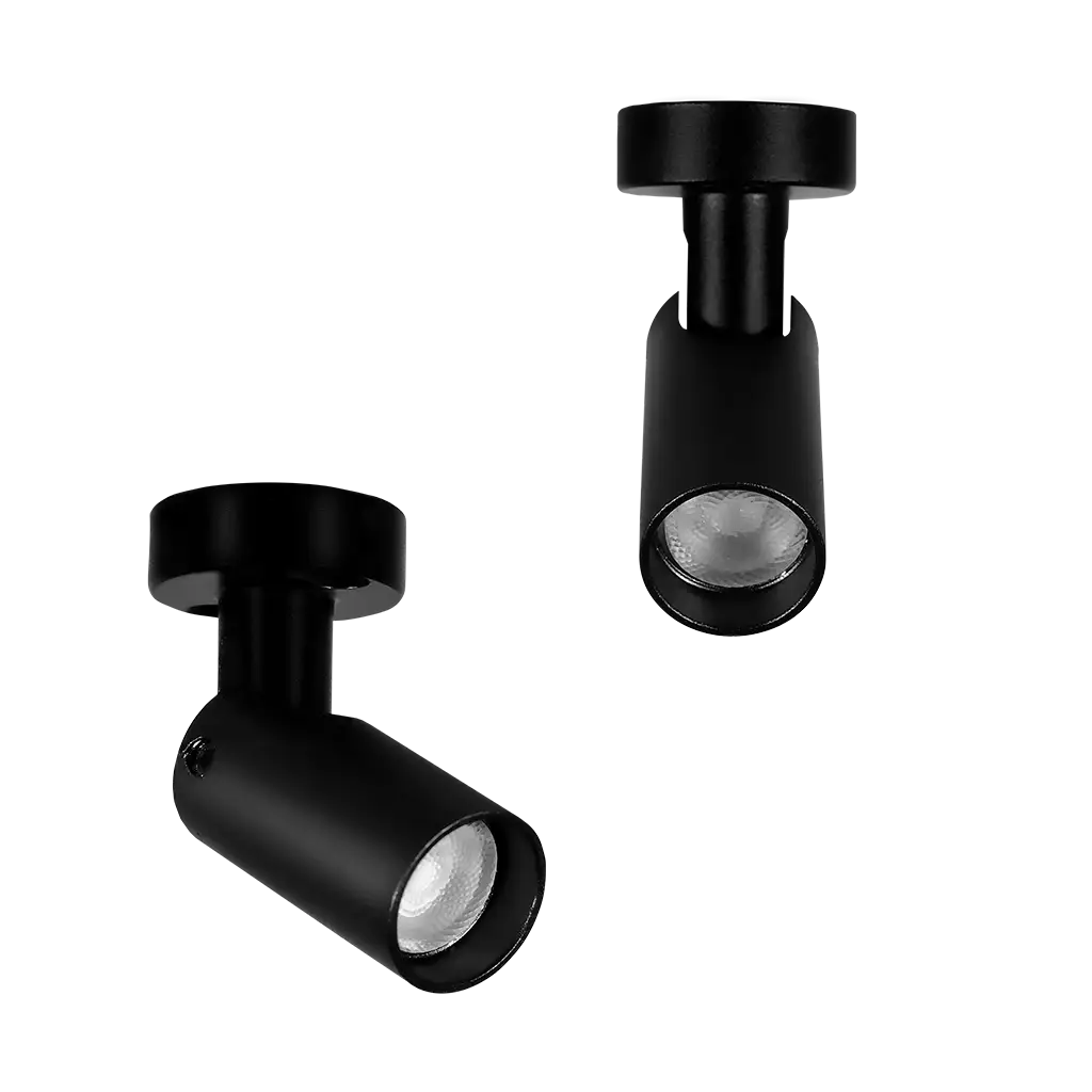 Luminario para sobreponer en mueble, atenuable tipo spot redondo, dirigible, de LED, blanco cálido, 1 Watt, óptica 30°, aluminio acabado negro, 24 V cc, protección IP20