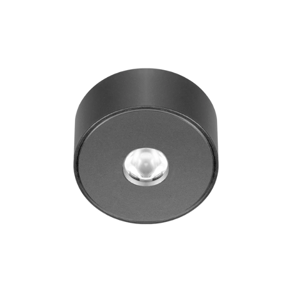 Luminario para sobreponer en mueble, atenuable redondo, de LED, blanco cálido, 2 Watts, óptica 24°, aluminio acabado negro, 24 V cc, protección IP20.