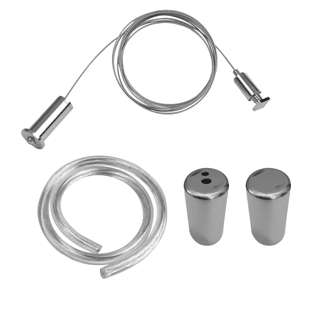 Kit que incluye dos casquillos aluminio acabado cepillado (uno superior con orificios y uno inferior sin orificios), un cable de acero de 2 m de largo con dos soportes para fijación y 2 m de cable transparente calibre 22