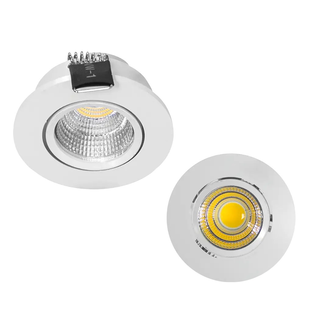 Luminario de techo, de led, blanco cálido, 3 Watts, óptica 120°, redondo, de empotrar dirigible, aluminio acabado blanco, 100-240V ca, protección IP20