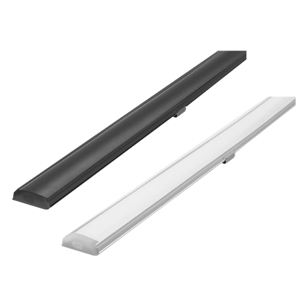 Kit de perfil flexible para tira extraplana de led, sin ceja, que incluye, perfil rectangular de aluminio acabado negro de 3 m, mica difusa negra traslucida de 3 m, kit de 2 tapas laterales y kit de 2 grapas, de sobreponer, protección IP20.