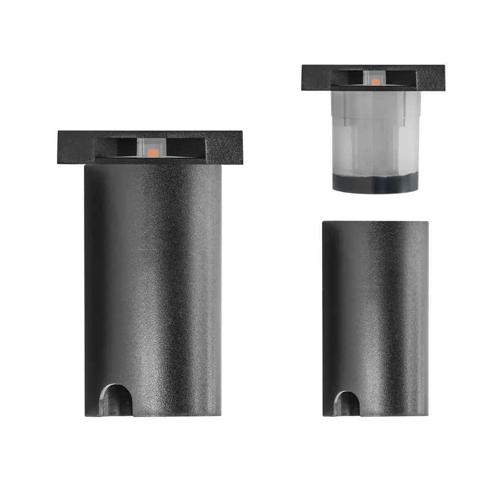 Luminario de piso, de LED, blanco cálido, 0.5 Watt, cuadrado con una salida de luz, de empotrar, policarbonato acabado negro, incluye housing de policarbonato, 100 – 240V ca, protección IP67.