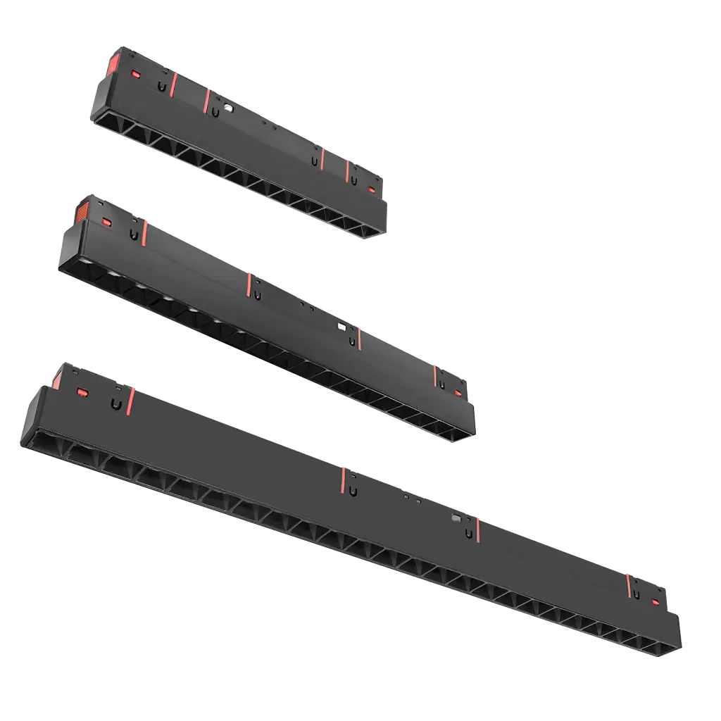 Luminario para riel magnético puntual rectangular, de LED, 2 700 K / 4 100 K / 5 500 K, 24 Watts, óptica 24°, aluminio acabado negro, 48V cc, protección IP20, con cambio de temperatura de color controlado vía aplicación