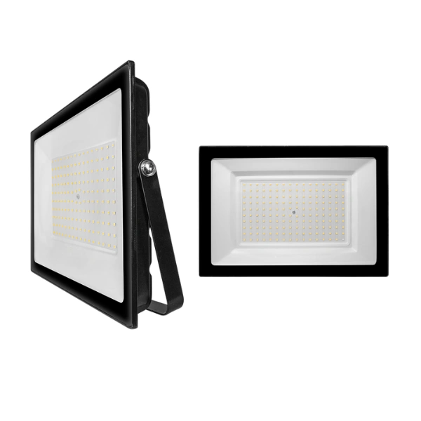 Luminario tipo reflector plano, de led, blanco cálido, 200 Watts, óptica 120°, rectangular, de sobreponer dirigible, aluminio acabado negro y cristal templado, 100-240V ca, protección IP65.