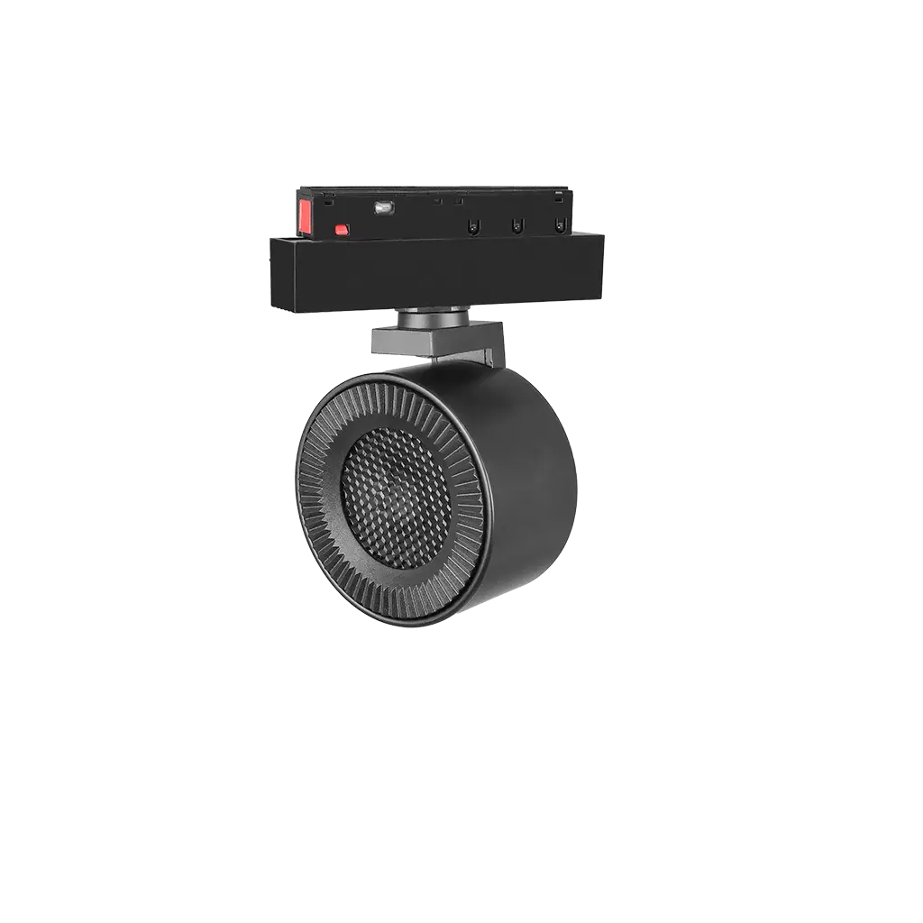 Luminario para riel magnético, sobrepuesto redondo, de LED, con filtro tipo louver honey, 2700 K / 4100 K / 5500 K, 15 Watts, óptica 24°, UGR 19, aluminio acabado negro, 48V cc, protección IP20, con cambio de temperatura de color controlado vía aplicación.