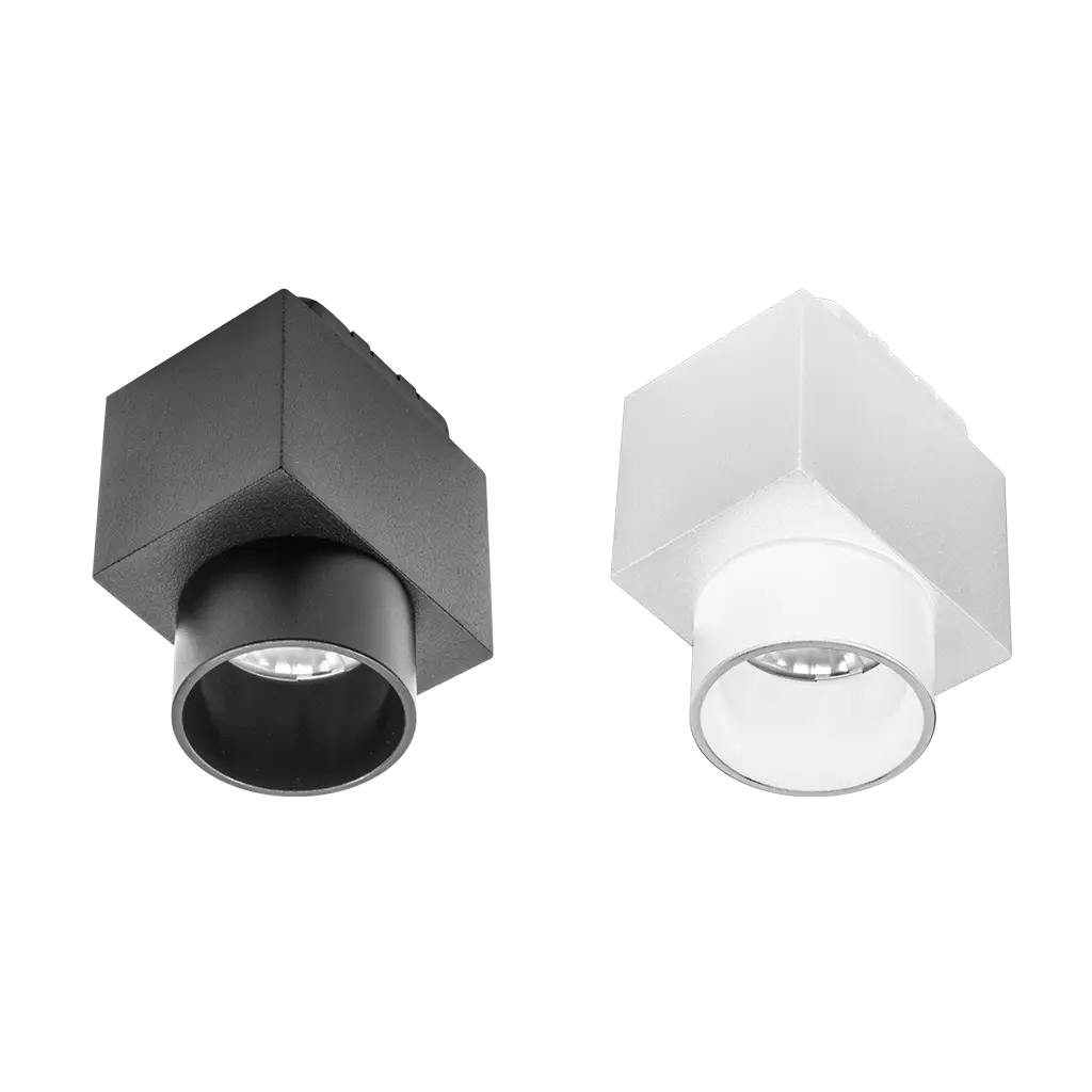 Luminario para mini riel magnético, cuadrado de sobreponer con arillo antideslumbrante, de LED, blanco cálido, 6 Watts, óptica 30°, aluminio acabado negro, 48 V cc, protección IP20