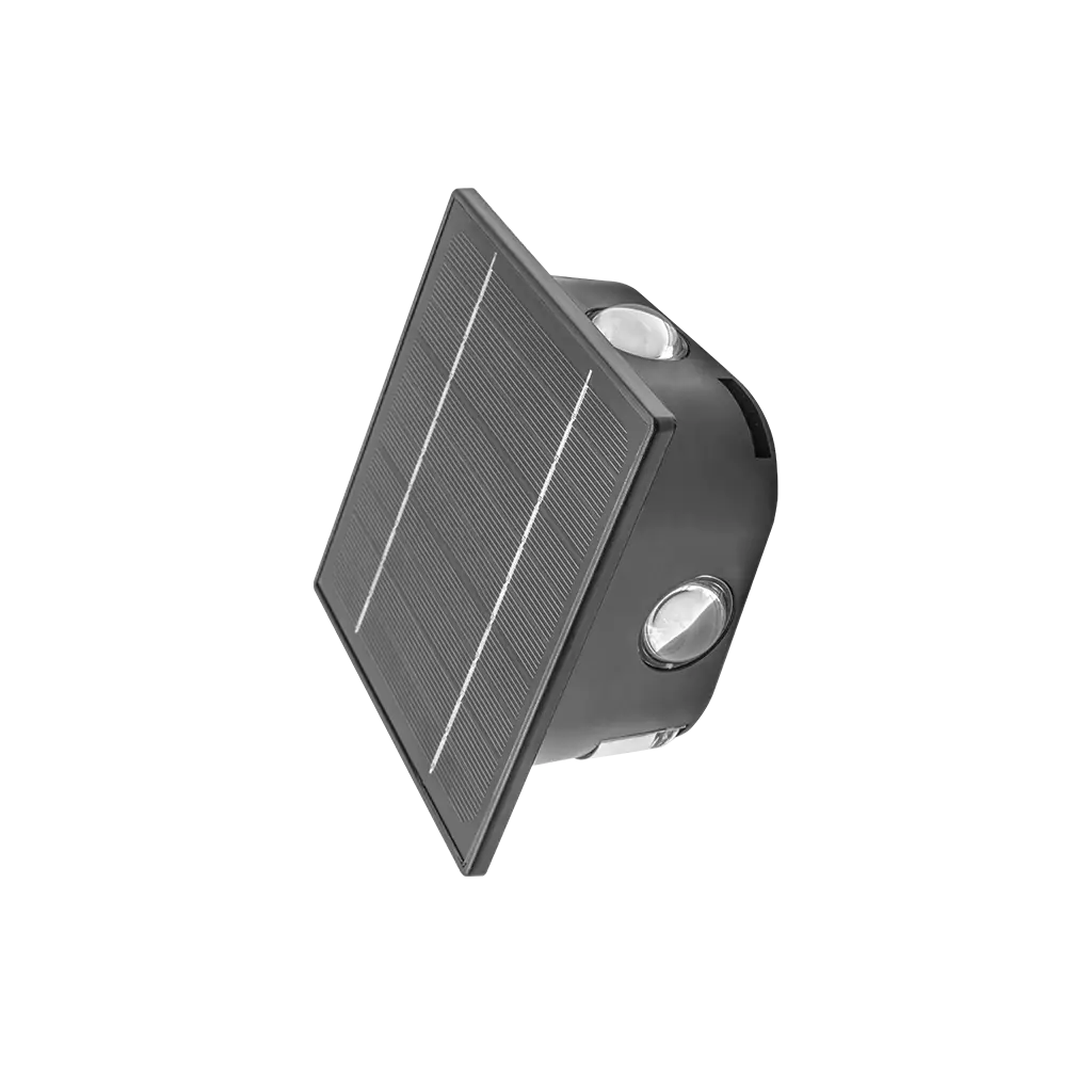 Luminario solar, de LED, blanco cálido con 6 lentes, 2 Watts, óptica 360°, cuadrado, de sobreponer en pared, policarbonato acabado negro, dos niveles de brillo seleccionables con interruptor, batería de litio de 3.2 Vcc 1300 mAh remplazable, protección IP54.