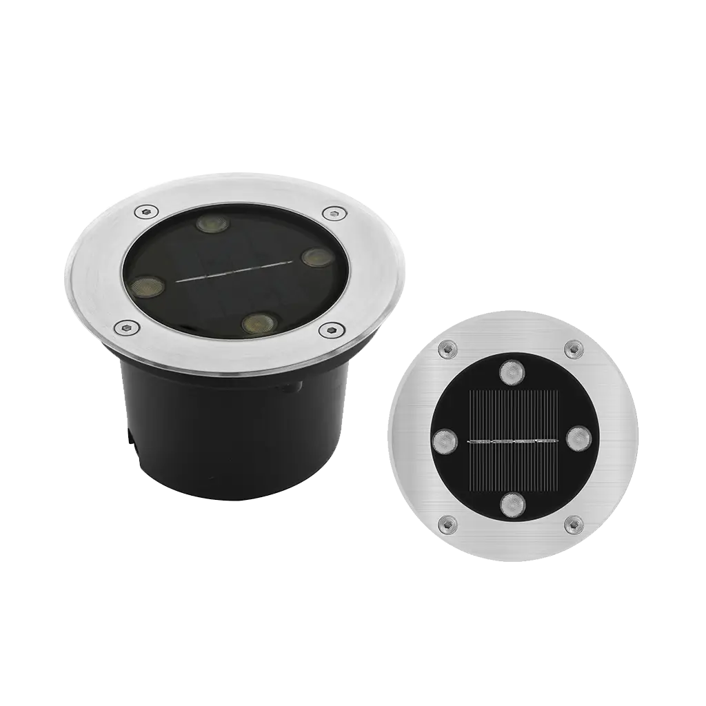 Luminario solar, de led, blanco cálido, 4 Watts, óptica 120°, redondo, de empotrar, acero inoxidable, sensor de obscuridad, batería de litio de 1.2V 600 mAh remplazable, incluye housing, este luminario NO debe de pisarse, protección IP67.