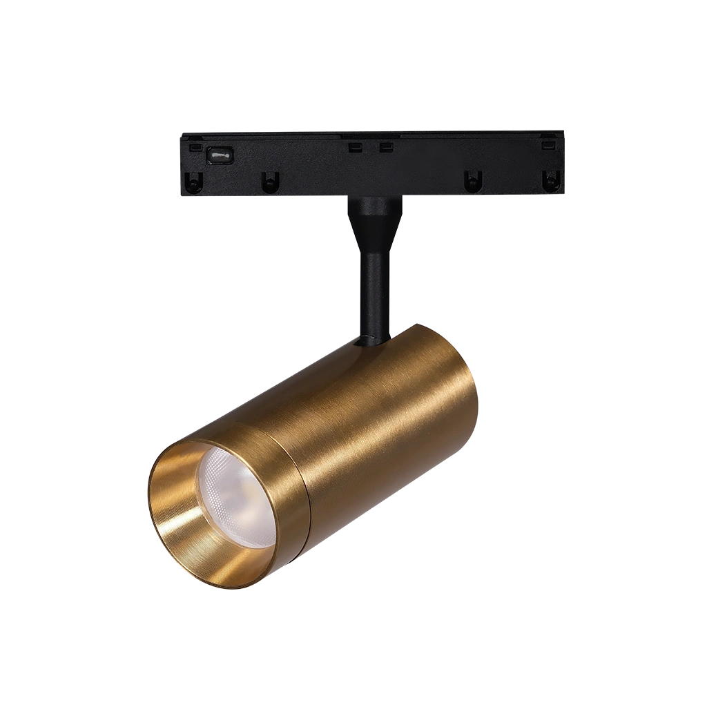 Luminario de LED para riel magnético, tipo spot dirigible, 4 en 1 (2 700 K / 4 100 K / 5 500 K / Smart) 7 Watts, óptica 24°, aluminio acabado dorado, 48V cc, protección IP20, con cambio de temperatura de color controlado vía interruptor físico o aplicación