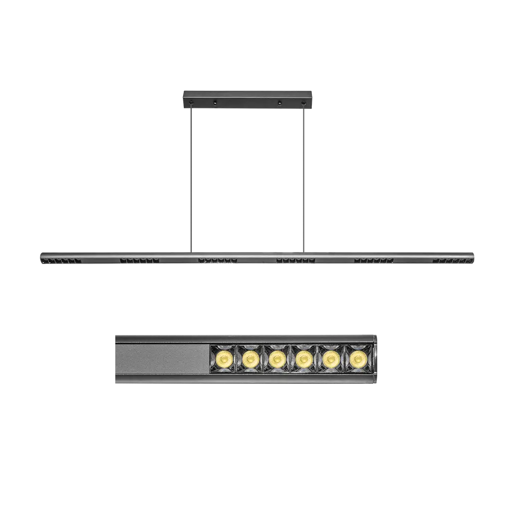 Luminario de LED, blanco cálido, 25 Watts, óptica 36°, rectangular, de suspender (incluye canope para sobreponer en techo), aluminio acabado negro, 85-265V ca, protección IP20