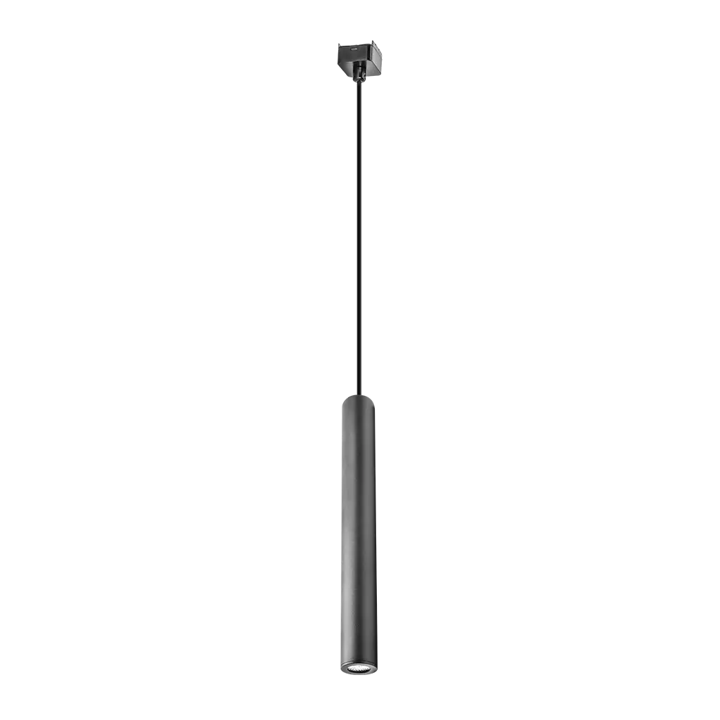 Luminario para mini riel magnético, de suspender, de LED, cilíndrico blanco cálido, 6 Watts, óptica 36°, aluminio acabado negro, 48V cc, protección IP20.