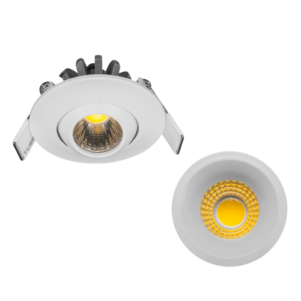 Luminario de techo, de led, blanco cálido, 3 Watts, óptica 35°, redondo, de empotrar dirigible, aluminio acabado blanco, 85-265V ca, protección IP20.