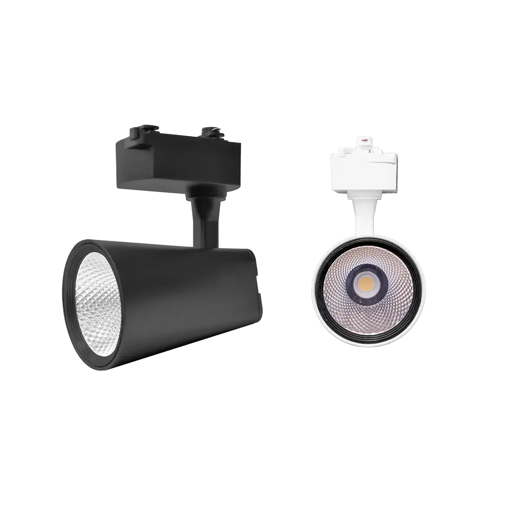 Luminario para riel electrificado, de led, blanco neutro, 20 Watts, óptica 35°, de sobreponer dirigible, plástico ABS aluminio/ acrílico acabado negro, 85-265V ca, protección IP20