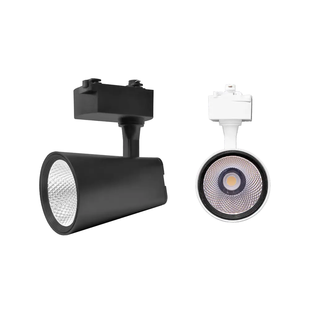 Luminario para riel electrificado, de led, blanco neutro, 30 Watts, óptica 35°, de sobreponer dirigible, plástico ABS aluminio/ acrílico acabado negro, 85-265V ca, protección IP20