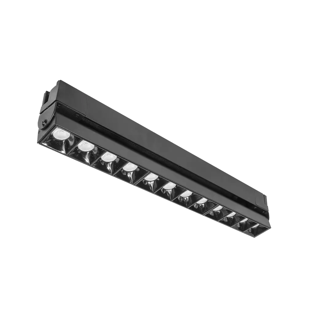 Luminaria para riel electrificado, led, blanco cálido, 30 Watts, puntual rectangular dirigible, óptica 36°, de sobreponer, aluminio acabado negro, 110-240V ca, protección IP20