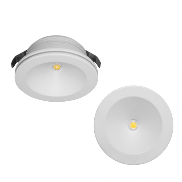 Luminario de techo, de led, blanco cálido, 2.5 Watts, óptica 90°, redondo, de empotrar, aluminio acabado blanco, 85-265V ca, protección IP20.
