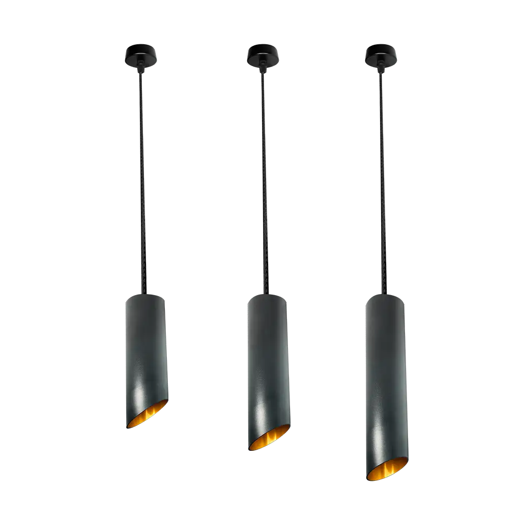 Luminario tubular de suspender para lámpara tipo dicroica GU10, máx 50 Watts, óptica 120°, 6 cm diam * 40 cm alto, 1 m cable, aluminio acabado negro/dorado, protección IP20