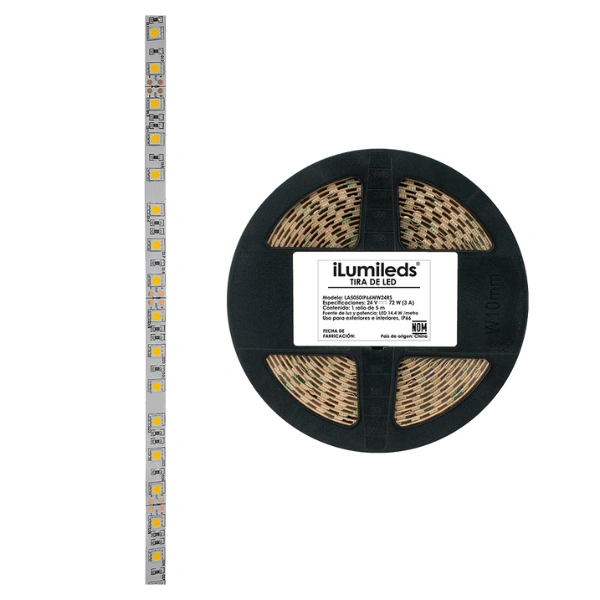 Tira extraplana para exteriores e interiores, 60 LEDs por metro tipo 5050, rollo de 5 metros con cinta 3M autoadherible para su fijación, cortes cada 10 cm.
