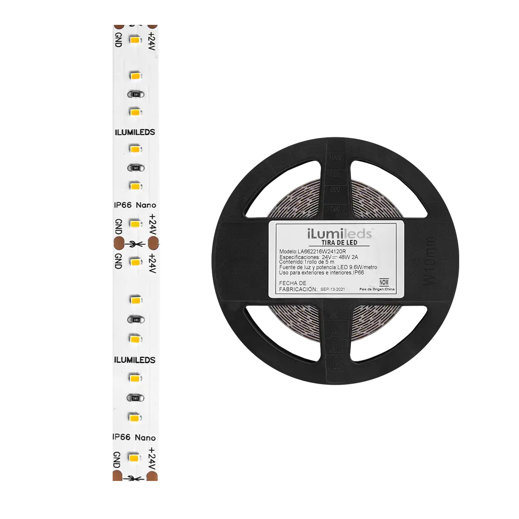 Tira extraplana, de led 2216 5 m con 120 leds por m, blanco cálido, 9.6 Watts por m, óptica 120°, pista de cobre acabado blanco, cubierta barniz nano al alto vacío con autoadhesivo 3M CRI 90 PCB 3 oz doble cara, 24V cc, protección IP66