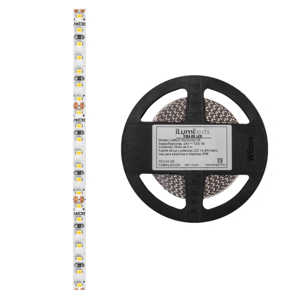 Tira extraplana, de led 2216 5m con 210 leds por metro, blanco cálido 2200 K, 14.4 Watts por metro, óptica 120°, pista de cobre acabado blanco cubierta barniz nano al alto vacío con auto adhesivo 3M CRI 90 PCB 3 oz doble cara, 24V cc, protección IP66.