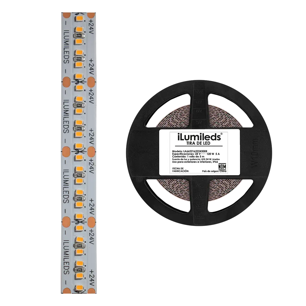 Tira extraplana, de led 2216 5 m con 300 leds por m, blanco cálido, 24 Watts por m, óptica 120°, pista de cobre acabado blanco cubierta barniz nano al alto vacío con auto adhesivo 3M CRI 90 PCB 2 oz doble cara, 24V cc, protección IP66