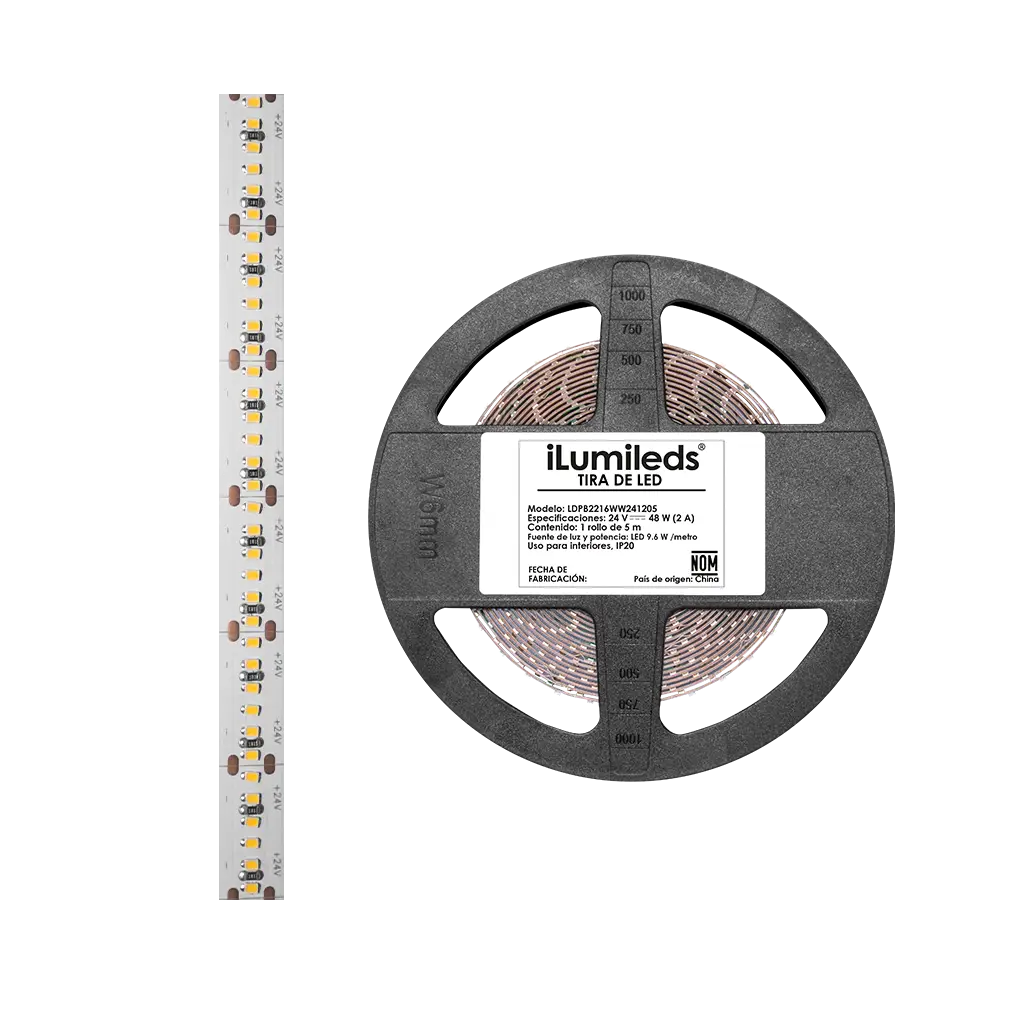 Tira extraplana, de led 2216 5 m con 300 leds por m, blanco cálido 1 800 K 24 Watts por m, óptica 120°, pista de cobre acabado blanco con auto adhesivo 3M CRI 90 PCB 2 oz doble cara, 24V cc, protección IP20