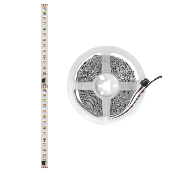 Tira extraplana, de LED 2835 5m con 120 LEDs por metro, blanco cálido tipo pixel, 8 Watts por metro, óptica 120°, pista de cobre acabado blanco con autoadhesivo 3M, PCB 2 oz doble cara, 24 V cc, protección IP20.