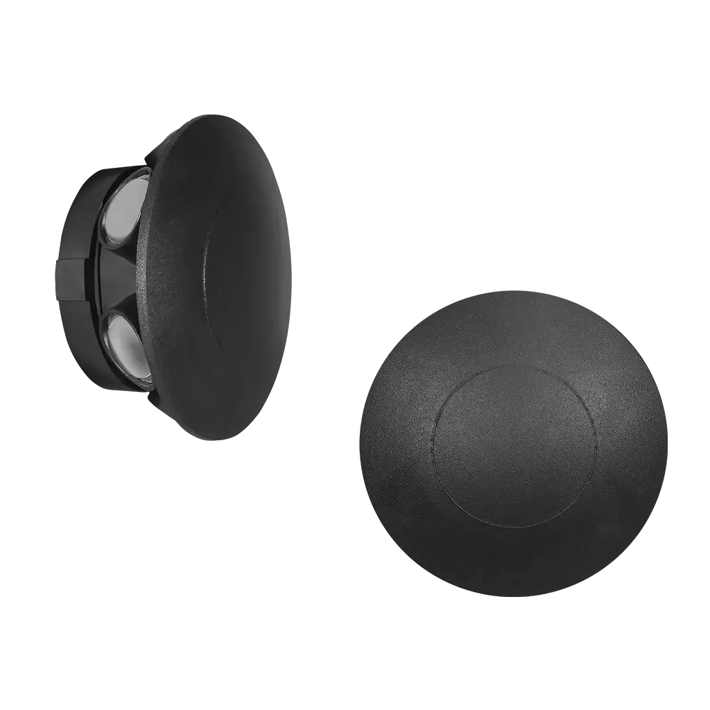 Luminario de pared, de LED, blanco cálido, 6 Watts, circular con seis salidas óptica de 45°, de sobreponer, policarbonato acabado negro, 100-265 Vca, protección IP65.