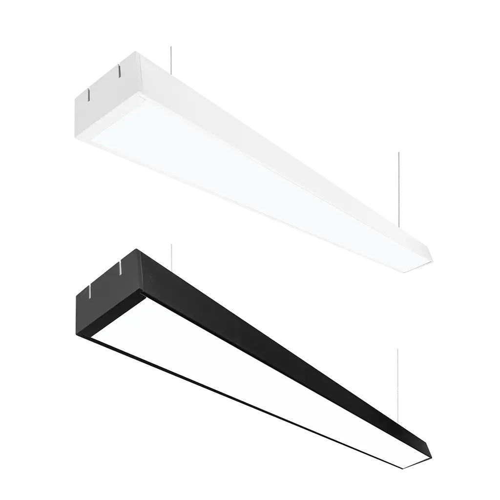 Luminario, de led, blanco cálido, 48 Watts, óptica 120°, rectangular, de suspender, aluminio acabado negro policarbonato lechoso, incluye soportes para su colgado, 85-265Vca, protección IP20