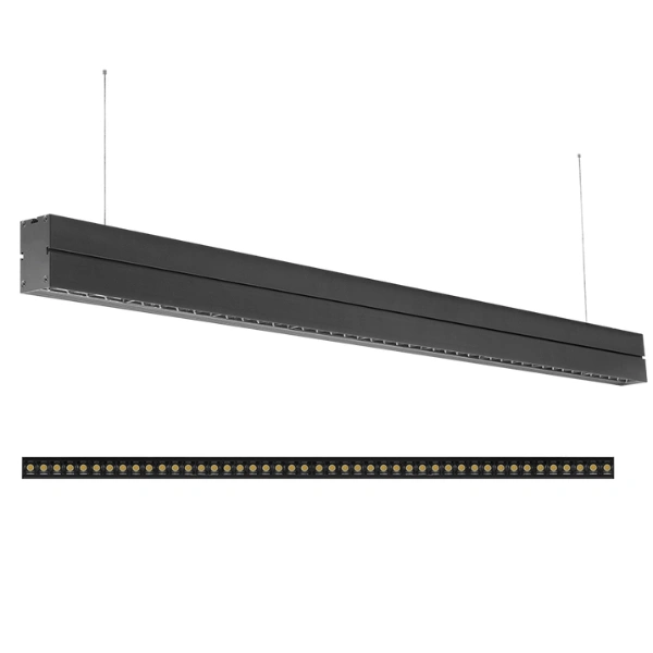 Luminario, de LED, blanco cálido, 36 Watts, óptica 30°, suspendido, policarbonato y aluminio acabado negro, incluye soportes de fijación y dos cables de acero de 100cm cada uno, 85 – 265V ca, protección IP20.