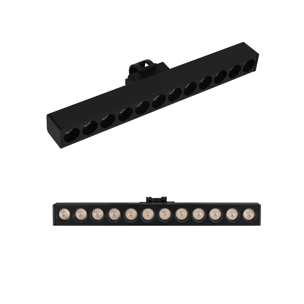 Luminario para riel RBKLT, rectangular puntual dirigible, de LED, blanco cálido, 12 Watts, óptica 24°, aluminio acabado negro, 24V cc, protección IP20, atenuable
