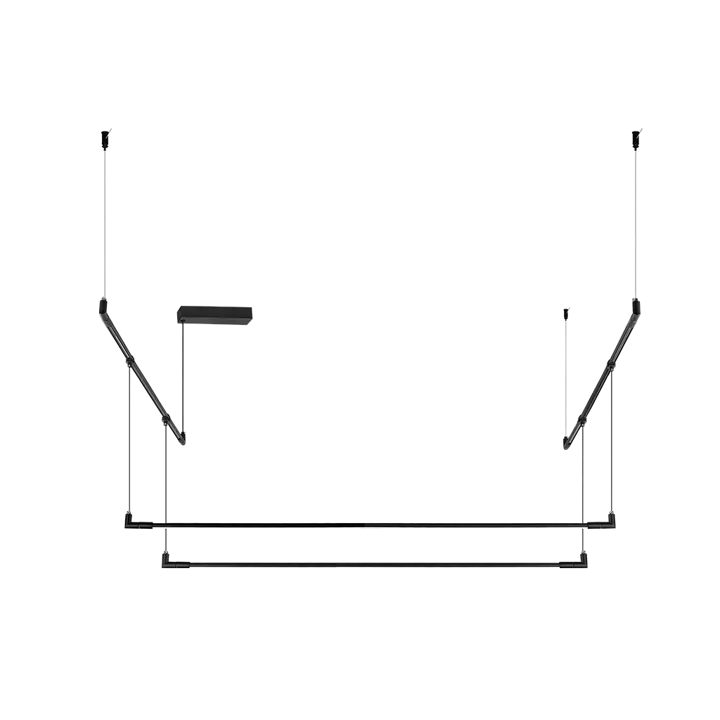 Luminario de LED para suspender en techo, tipo RUB CUBE, con cambio de TCC y atenuación vía control remoto o APP, 31 Watts, óptica 100°, aluminio acabado negro, 100 – 265 V ca, protección IP20, incluye dos líneas luminosas sobre dos rieles electrificados, con accesorios para fijación
