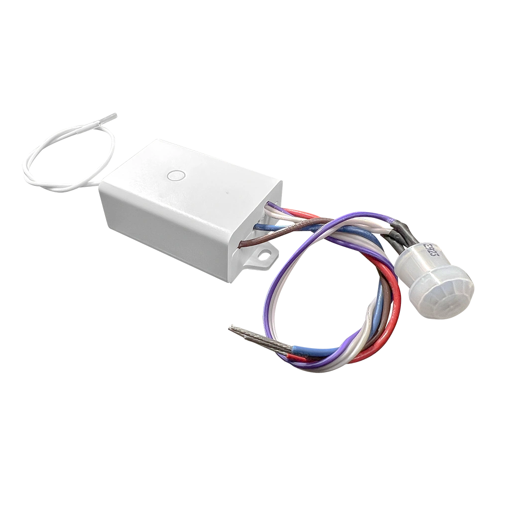 Interfaz cinética, encendido-apagado 127V ca 60Hz con sensor PIR y temporizador ajustable de 1 segundo a 4 minutos, ajustable mediante programación. 381W máximo (3 A). Grado de protección IP20.